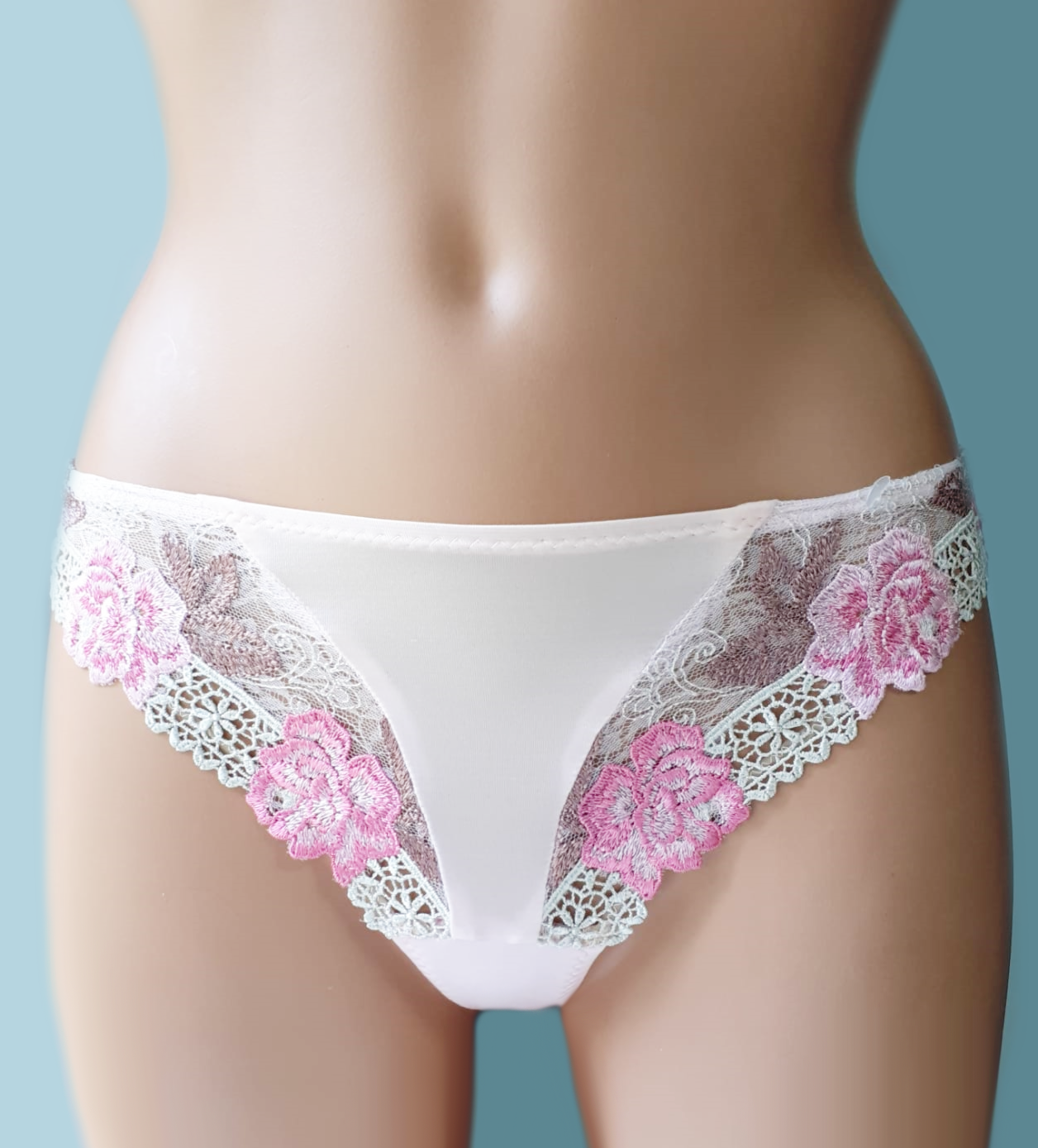 Трусы – стринг со средней линией талии, выполнены из эластичного полотна, ластовица дублирована хлопком.